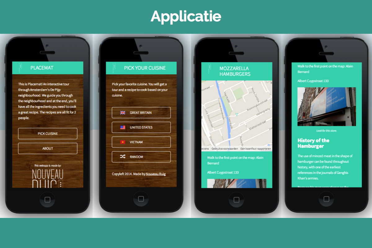 Nouveau Ruig was het eerste grote project van mijn HBO en was gelijk een goed begin. Wij bestonden uit een team van vijf en kregen 'culinaire liefhebbers' als doelgroep. Voor de opdracht moesten we een applicatie bouwen die een interactieve tour door de Pijp geeft. Wij hadden hiervoor verzonnen dat de gebruikers een keuken uitzoekt en een bijhorend recept en dan langs de winkels wordt gestuurd met de beste ambachtelijke ingredienten. Met dit project waren we 3de geworden van de opleiding CMD en waren hierdoor genomineerd voor de Golden Dot Awards van het HvA. Ook het project 'Rendezvous', dat op dit portfolio te vinden is, was genomineerd voor deze award.
