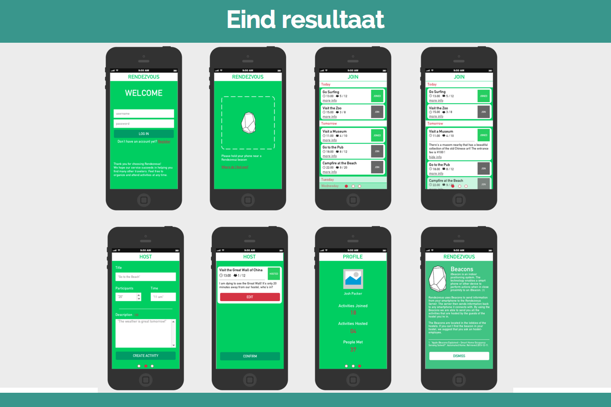 Voor een school opdracht van CMD moesten we een concept bedenken dat een probleem oplost d.m.v. van NFC. dit staat voor Near Field Communication en is het meest bekend van de OV-chipkaart. Met een team van zes hebben we 'Rendezvous' bedacht, dit is een applicatie gemaakt voor backpackers om sociale interactie makkelijker te maken. Met een i-beacon die bij een hostel staat kunnen de backpackers evenementen; zien, joinen en aanmaken. Op deze manier is het makkelijker om mensen te ontmoeten en niet te veel tijd besteden aan organiseren. Dit project was genomineerd voor de Golden Dot Awards van de HvA, net zoals 'Nouveau Ruig'.